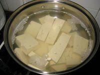 4.热锅内注入适量菜籽油,放入豆腐,慢火煎至两面金黄后捞出。