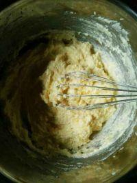 5.用手动打蛋器把鸡蛋液和黄油糖进行一个混合,鸡蛋液要分批放进去,大概两三次的样子,把它们融合在一起。