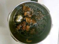 6.把牛肉放高压锅里,放入老汤、少量水、两勺黄酒、三勺老抽、两勺生抽、两勺味极鲜。高压锅耗水少不用放很多。